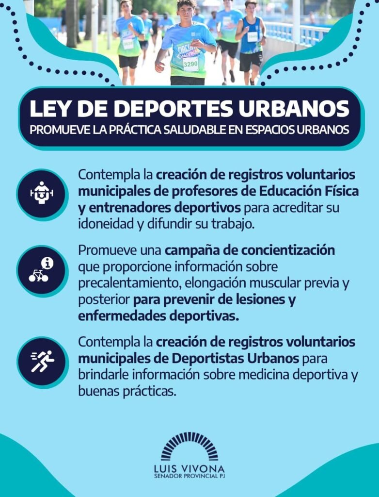 Con la reciente aprobación de la Cámara de Diputados de la Pcia. de Bs. As.; la Ley de Deporte Urbano es una realidad concretándose la iniciativa del Vicepres. 1º de la Cámara del Senado Bonaerense -que ya le había dado previamente la media sanción-. El corazón de la norma lleva impregnada la promoción de la actividad física en espacios públicos.