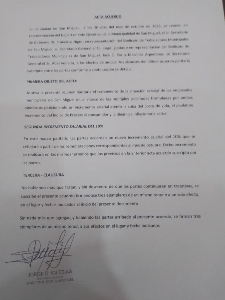 El Sindicato de Trabajadores Municipales de San Miguel (STMSM) cerró un nuevo aumento para el sector. El sec. Gral., Jorge Iglesias, firmó hoy el acuerdo en el municipio junto a los integrantes de la comisión directiva del gremio.